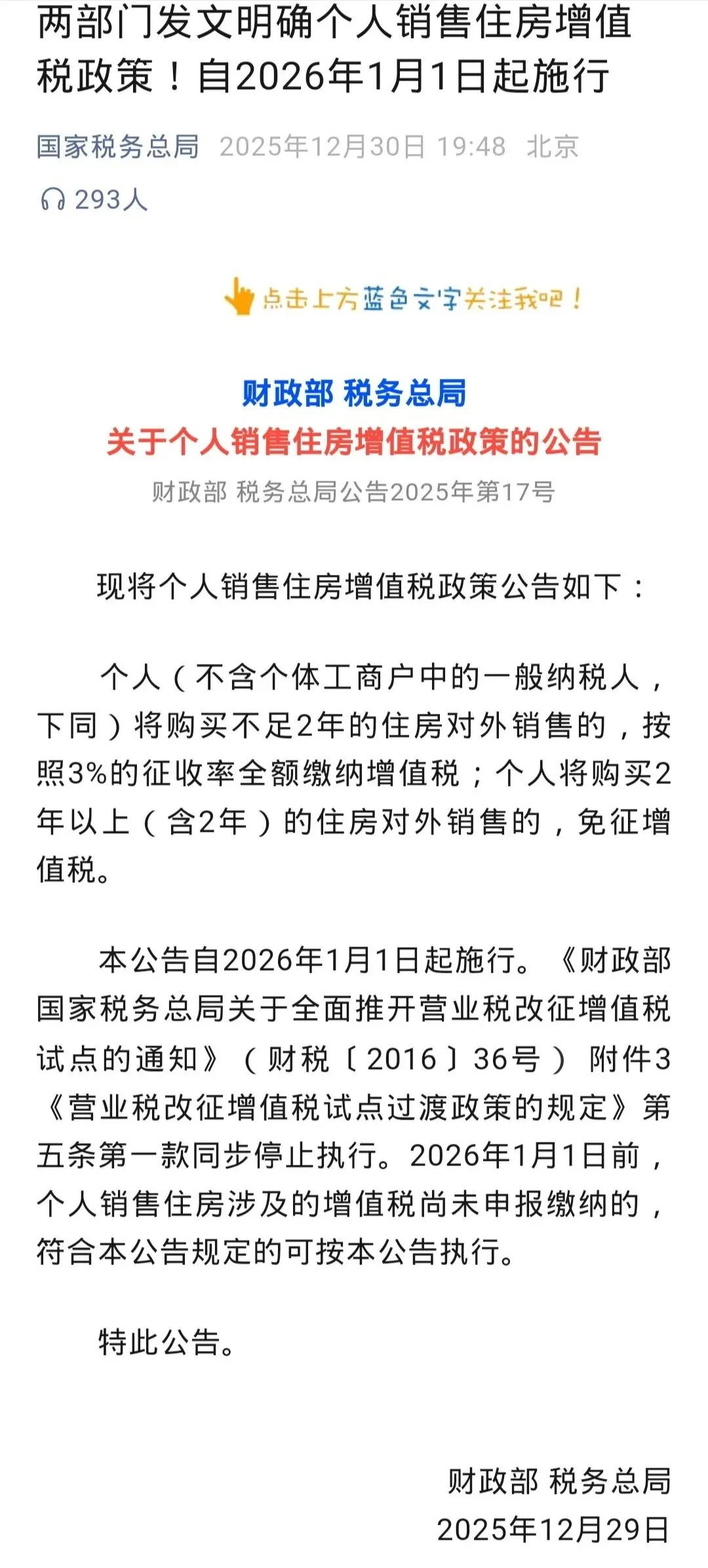 今日,财政部与税务总局联和发文:明年1月1日起个人房产过户将免增值税。具体公告原文如下: