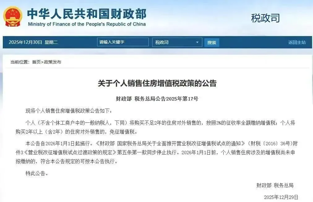就在刚刚官方宣布不满两年的,增值税由5%降至3%满两年及以上的,免增值税!2026年1月1日起执行!原文如下: