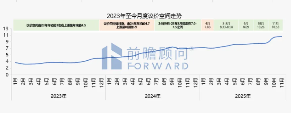 根据前瞻数据11月报,二手房议价空间已升至10.53%,创2023年以来新高,交易定价权明显向买方倾斜。市场正进入买卖双方基于价格共识达成交易的阶段。