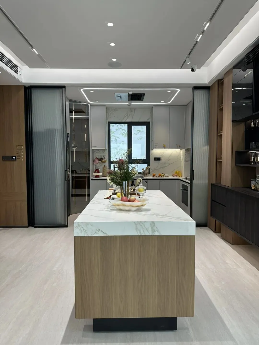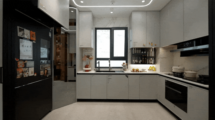 可变场景设计:客厅支持 “一键加一房”—— 聚会模式下最大化空间,观影模式下自动调整电视背景墙位置;餐厅配备可变岛台(备餐、聚餐、品茶多场景切换)与隐藏式早餐台,解决小家电收纳痛点。
