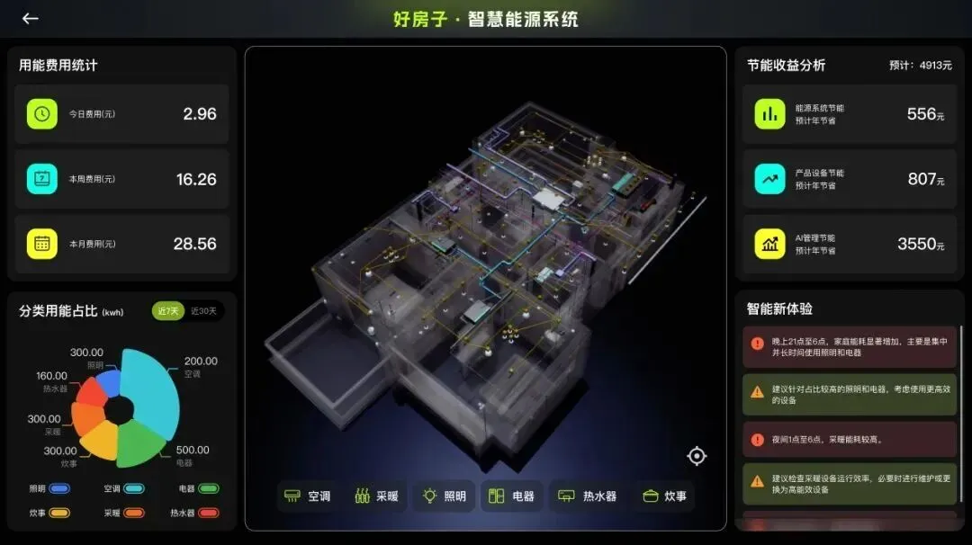-针对 “能耗不透明” 痛点,研发智慧能源系统,让 “每日费用、分类用能占比、节能建议” 实时可见,契合家庭 “省钱” 需求。