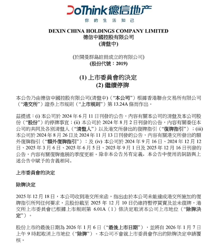 2025年12月19日,德信中国控股有限公司发布公告:港交所上市委员会已决定取消其上市地位。