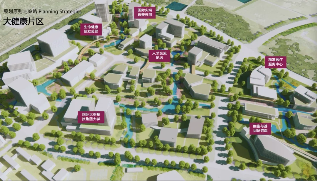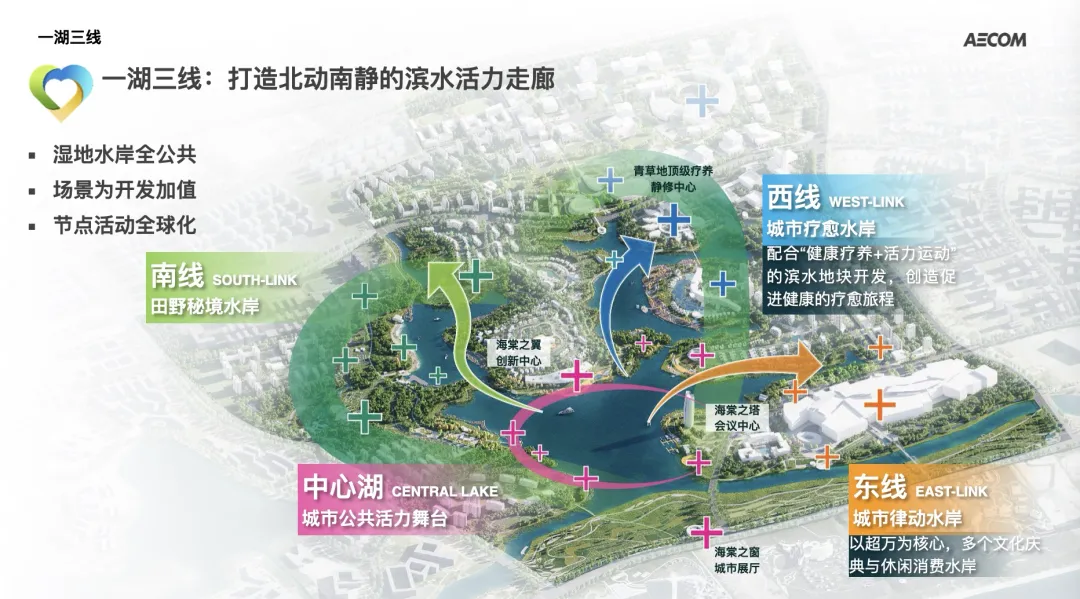西线配合“健康疗养+运动社交”的滨水开发主题,打造城市疗愈水岸;南线搭接生态保育与农田资源,打造三生共融的生活环境。
