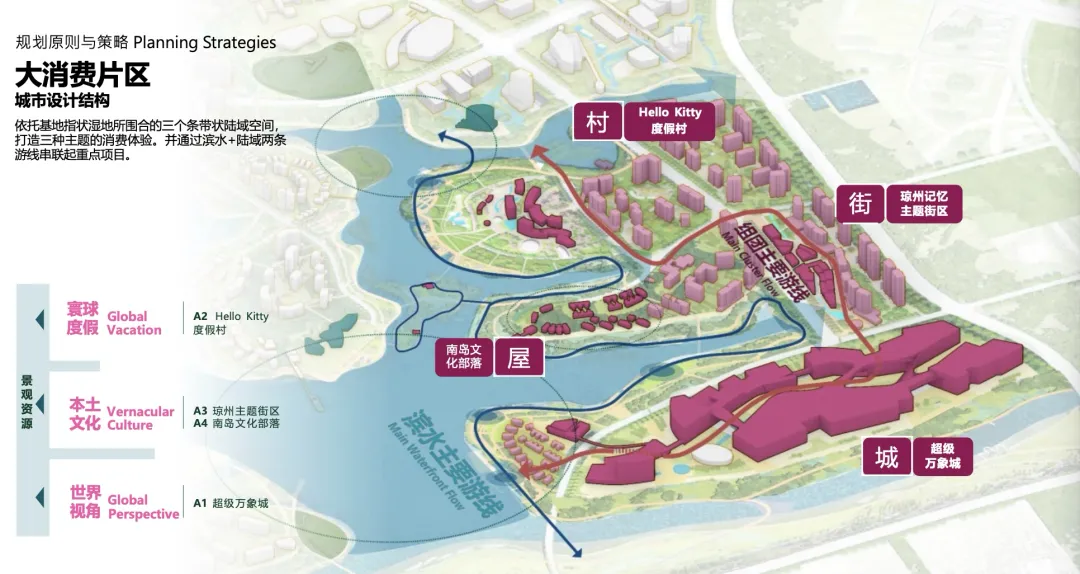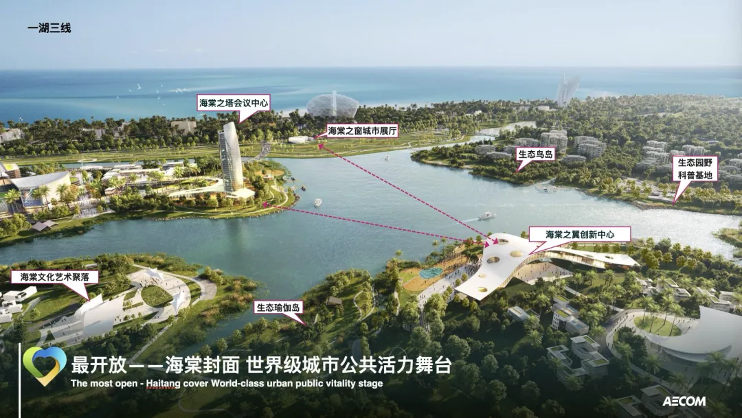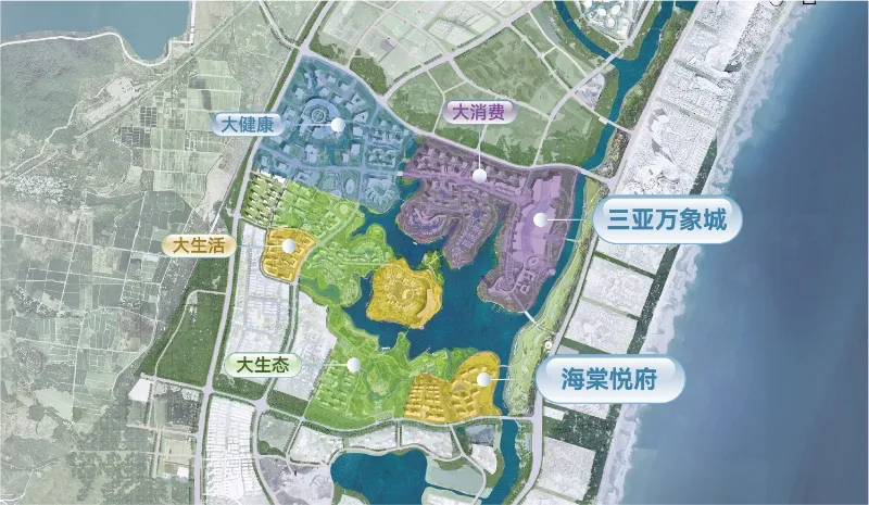 其中,中心湖作为纽带,有效串联起海棠湾八大功能区,是未来海棠湾的名片也是重要的国际封面;东线以“三亚万象城”为核心,打造城市形象展示界面;