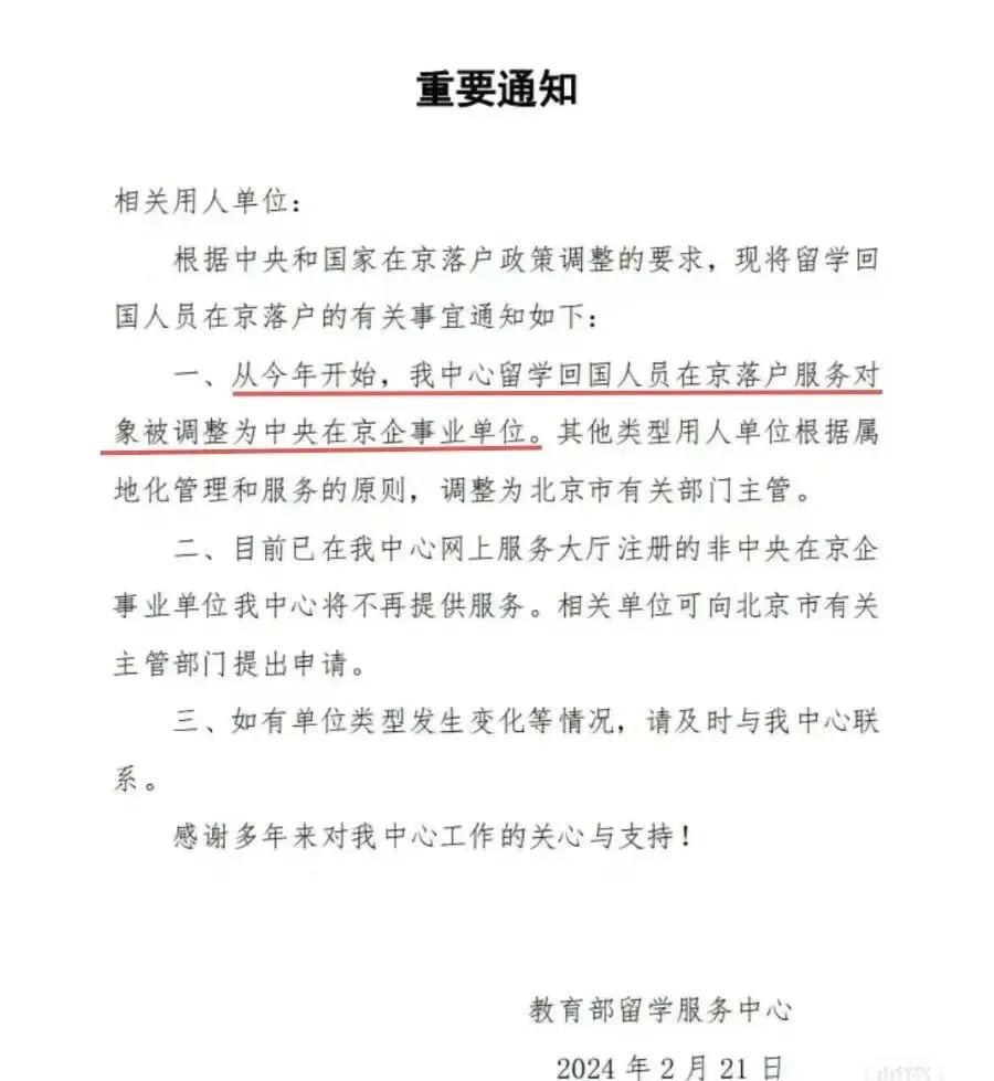 最后值得一提的是,由于积分落户指标有限,当前北京各区实行的是名额配给制,以往的父母投靠、夫妻投靠都收紧了,现在网上很多朋友说落户要排队等指标。甚至留学生落户北京,从今年开始也只有北京央企才有指标。