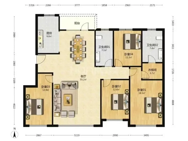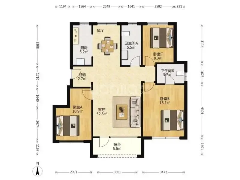 朗庭园88.95平三室南北通透户型,婚房!绝了!!!报价59.8!