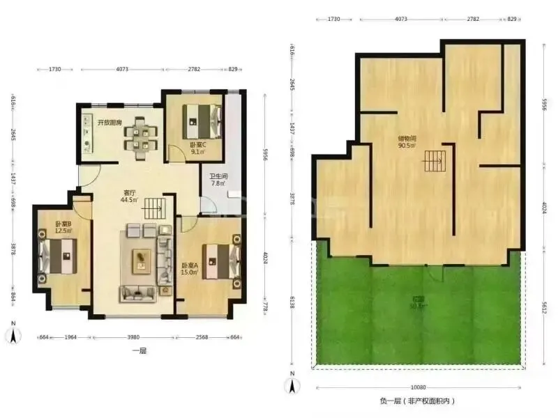 一楼带院40平!87.52平两室两厅,明卫,南北通透!三层玻璃,方太厨房,智能坐便!实木装修!