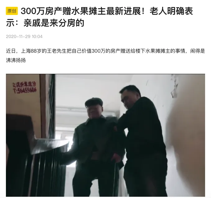上海一位孤寡老人把自己价值300万的房产,托付给了一位水果摊主;