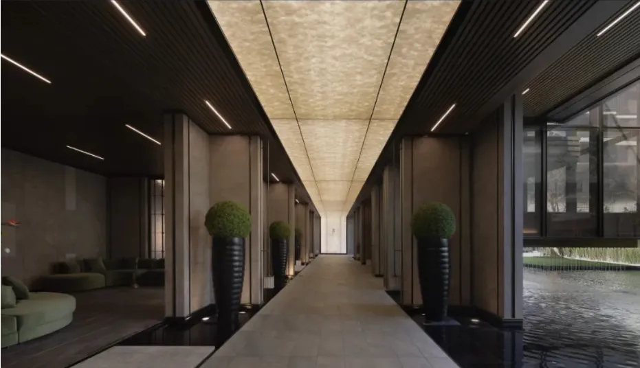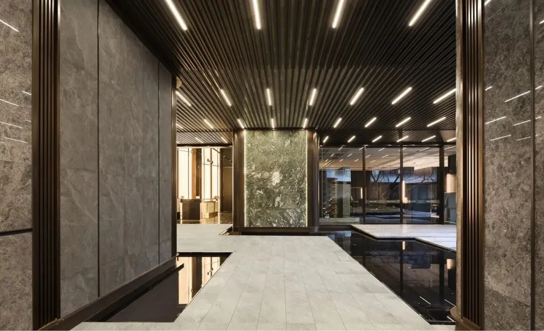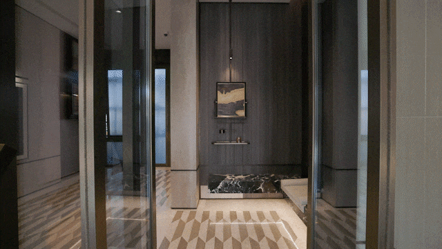 按照星级酒店行政酒廊标准来打造的归家大堂,入口甚至有价值10万的奢石照壁,和带LED大屏的酒店式前厅。电梯轿厢也有精致的悬浮吊顶;