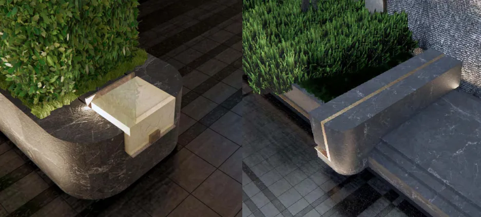 为了匹配项目整体定位的海派风格,还将景观地面、种植池、水池都定制成弧形设计,这要求在施工时,全部采用大板整板切割,在不同的弧形工序上穿插、复尺、契合,难度非常高。