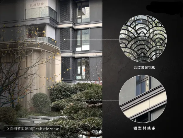 成都的中建壹品金沙公馆,为了打造高颜值的南北双立面,让背立面更美观,在空调机位的设备平台都用了定制的祥云纹激光铝板遮蔽。并且在激光铝板上增加了圆孔纱窗,便于后期清洁和防蚊虫。