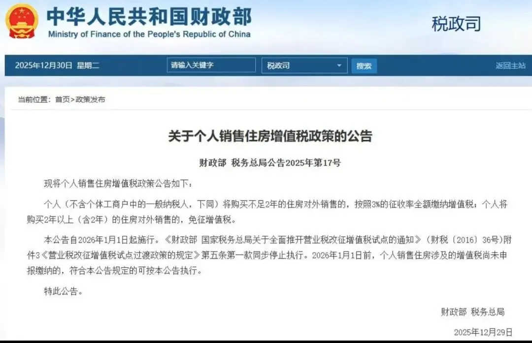 2025 年 12 月 30 日,财政部正式发布个人销售住房增值税政策公告,自 2026 年 1 月 1 日起全面施行。新规核心是统一全国计税标准、简化征管规则,大幅降低二手房交易税费成本,具体要点如下: