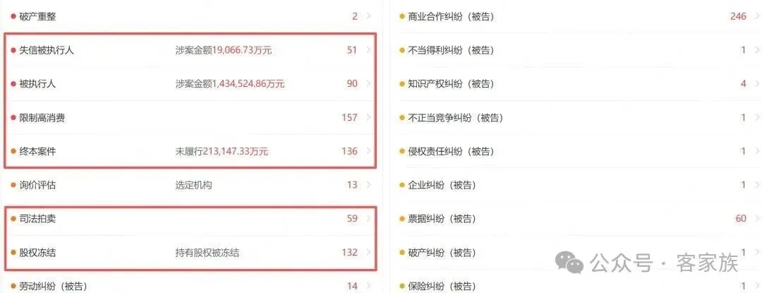 其中,富力地产失信被执行人涉案金额1.91亿元,被执行人涉案金额143.45亿,李思廉作为公司法人被限制高消费157次,公司终本案件未履行金额21.31亿元,股权冻结132次,票据违约38次等。