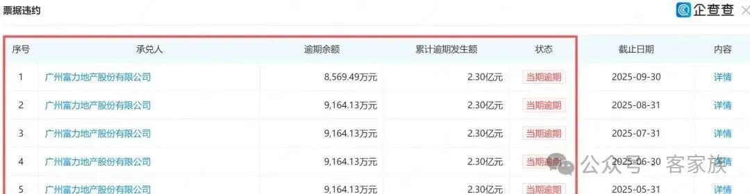 此外,从企查查获悉,广州富力地产股份有限公司已经是失信被执行人、被执行人、限制高消费及票据违约等。