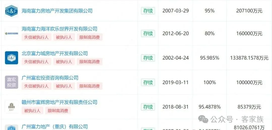 而且,富力地产股份有限公司旗下众多分子公司也已经成为失信被执行人、被执行人及限制高消费等。