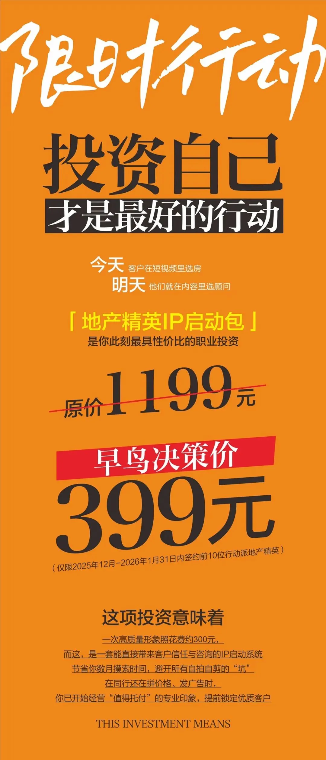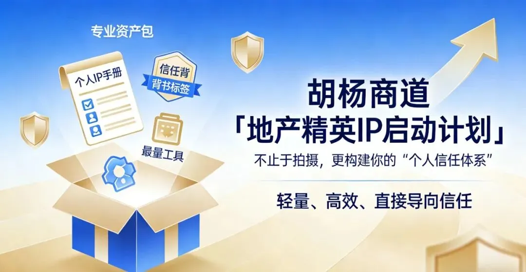 你懂谈判、懂选盘、懂规避风险,但这些隐形的专业,在线上世界是 “沉默的”。企业做内容需要系统,而地产精英破局,只需要一个精准的 启动键。我们为你准备的 “个人IP快速启动包”,只用 1条标杆视频 + 1张专业海报,助你完成从 “销售员” 到 “专业顾问” 的关键升级。
