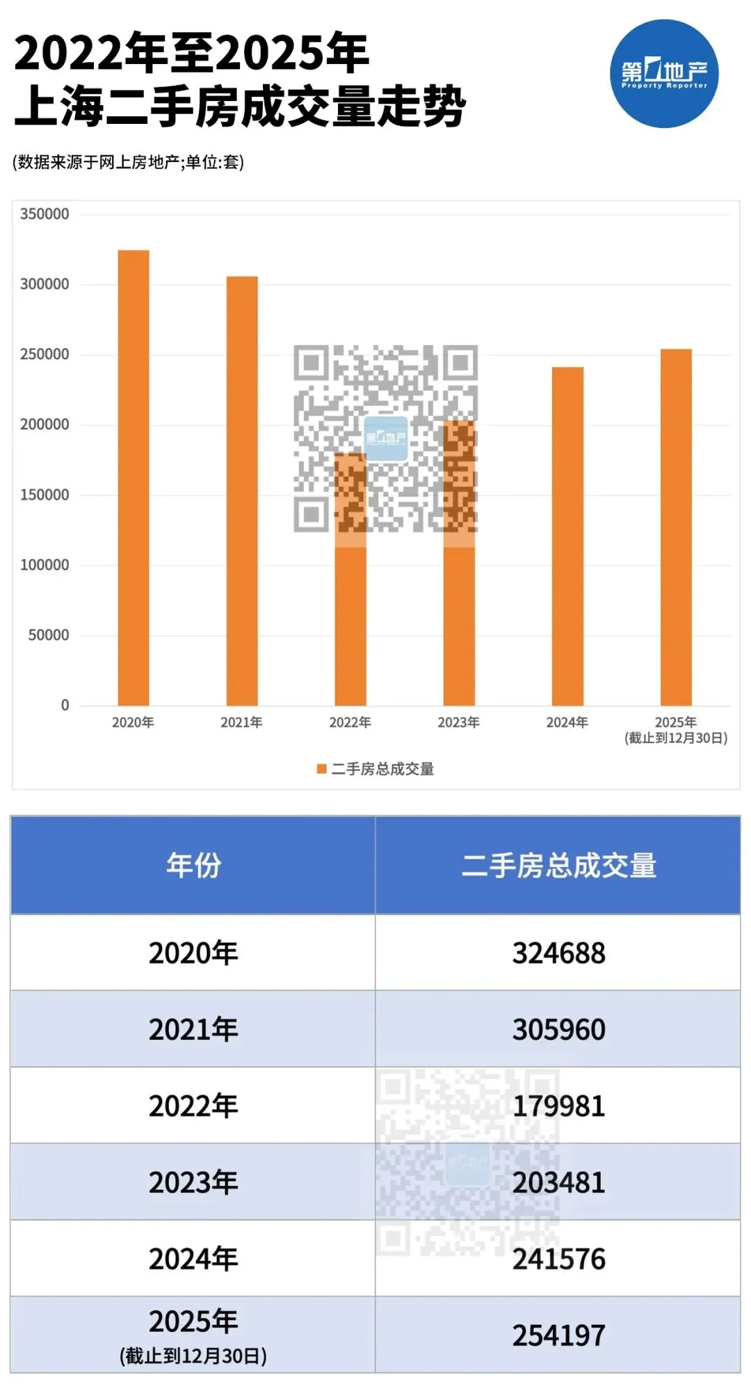 截至2025年12月30日,上海二手房共成交254197套,全年数据不仅轻松超越了2024年,还创下近四年新高。