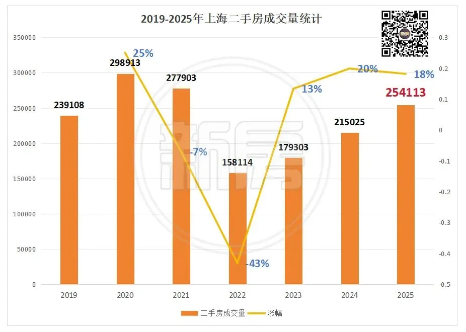 据上海市房地产交易中心披露数据统计,截至12月31日,上海二手房市场2025年已累计成交254113套。这一数据已经超越了2024年全年的242699套,更显著高于2023年的192543套,创下近4年来的成交新高,更是2019-2025年第三高!