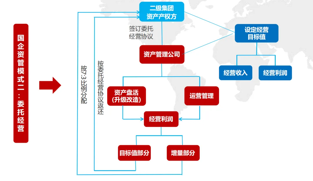 而经营收入分成三部分,一部分用来做资产盘活,比如升级改造、微改造等,另一部分则作为资产管理公司必要的成本费用开支,比如一定比例委托经营管理费用、人员工资、薪酬、物业维修维护等。剩下的经营利润,按股权比例来返还给资产的产权方。二级企业和资产管理公司签订委托经营协议,确定委托经营资产的范围,对这些资产设定一个经营目标值。