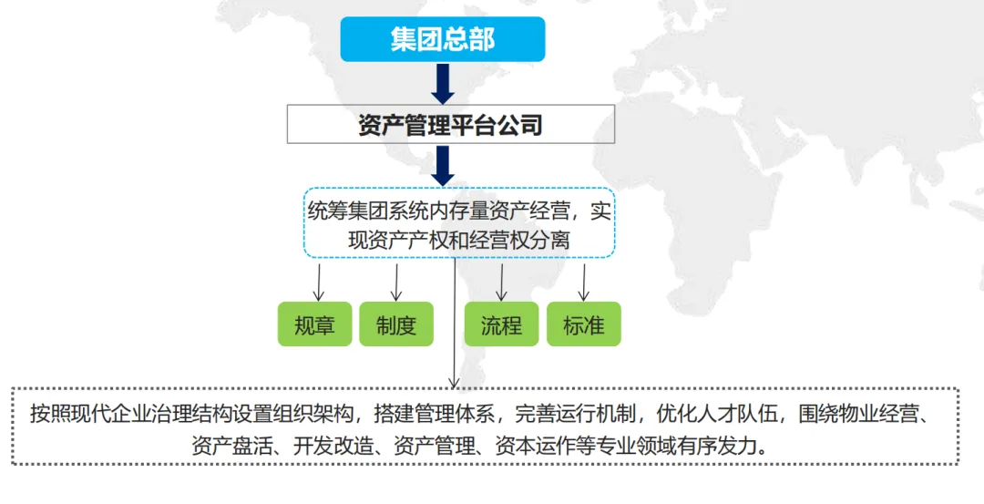第一,集团总部需要牵头做顶层设计,战略职能部门组织成立资产管理平台公司,作为资产管理的平台和抓手。第二,需要提供组织保障,集团层面成立的资产管理公司,将资产统筹到平台公司,实现存量资产的产权、经营权分离,实现存量资产经营过程当中能够实现集中化、规模化、专业化、市场化。组织保障包括组织架构、人员定岗定编、括岗位职责和边界,以及决策机制和决策的流程。第三,要注重能力培养,按照资产运营管理的模式,平台公司成立之后,需要建章立制,设立体系流程、标准,比如资产租赁管理制度、项目投资管理制度、物业招租流程、合同审批流程等等。在这个过程当中,需要搭建懂产业规划、招商投资、项目管理、项目策划等专业化的人才队伍。通过人才队伍的建立和完善,建立现代企业管理制度和体系,后续围绕物业经营,这是最基本层面的物业经营、资产盘活以及开发改造、资产管理和资本运作各方面去发力。第四,坚定地进行数字化转型,利用好数字化信息工具和平台。一是为了提升运营管理的效率和效益。二是做好风险管控的,比如在资产经营过程当中的合规经营决策,还有流程的合规,事后审计各方面合规以及相关流程的合规。目前国央企主力推进数字化,通过数字化工具赋能管理,运用资产管理系统来加强土地、物业的管理,再配合进行业务的流程的压缩精简,实现规规范化和集约化。戳这里,了解国企资产管理解决方案以市场研判、业态研究和项目定位,盘活“原始”经营和落后经营状态的土地、工业园区、老旧厂房、仓库,整体规划、改造升级、功能改造、价值再造、产业升级,注入产业资源和品牌资源, 提升资产品质,其适应未来城市发展属性。比如,老旧的园区、仓库等物业,不能说简单的推倒拆除重建,可能会涉及一些历史遗留的问题,原来没有产权证的物业,后续就没有办法重建起来。这是一个需要注意的环节。在这个过程当中,需要对整个市场进行研判、业态进行研究、项目进行定位,从整体来进行规划和升级改造以及价值再造。也要结合城市和区域发展的特点,实现再开发利用,再注入一些产业资源和品牌资源。产业资源方面,有主业经营的国有企业比较重视的,比如环保集团,可能涉及到低碳环保相关概念的产业。品牌资源方面,引入一合作方的品牌资源,提升项目的品质。整个项目升级改造完成之后,重新进入市场,对整个园区和地块空间再进行赋能,使这个园区能够适应城市发展的属性,后续也带动整体项目经营的和经营效益的提升和运营价值的提升。存量物业的升级改造,比如涉及一些老旧物业,通过软硬件的改造,业态布局的功能更新,项目亮点的塑造。比如,建筑物业的内外装修,新增一些智能化的设施,使得对整体客流量、租金以及出租率,能够得到稳步提升,从而带来整个物业的升值。对一些有潜力的老旧物业进行微改造。比如像办公酒店以及商务中心进行重新定位和升级改造。更新和调整业态,进行跨界合作,业态结构以及在主题打造和品牌组合上面来适应市场的上新趋势。这里也涉及到一些考核机制。要预估下一年的投资改造成本,以及对经营方面的影响。在考核过程当中,适当考虑,比如说降低或者是剔除需要升级改造、微改造的这些资产年度考核。对一些物业翻新升级改造的项目,第一年可能是改造期,第二年为培育期,第三年才是真正的运营成熟期。以三年为期,来设置经营的考核目标。我们在前期启动的过程当中,每一年都有新进入培育期的项目,每一年都有进入成熟期的资产项目,而且每一年也纳入升级改造的项目,这样对整体的影响不是很大,但是对刚开始起步转型的影响还是比较大的。想要更快地发展,离不开高效激励的机制,对资产管理团队充分授权,建立激励机制,激励包括以下几个部分:一是比如物业升级改造取增量、完成超额完成经营目标增量的部分,拿出一定比例,作为团队的奖励。二是在成本管控、工期进度方面,原计划是半年或者是一年的,提前三个月或者是多长时间投入运营使用的,也可以做奖励。三是设置一些专项奖项目,比如引入优质龙头企业大客户、长期稳定大客户,可以设置专项的奖励。在资产管理方面,国央企有巨大的优势,但也存在一些问题。笔者认为,接下来企业需要以业务部门为核心的虚拟指挥部,配备各类资产经营的管理团队,科学推动项目完成。这都是地产人转型的机遇。