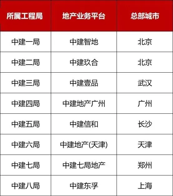 根据中国建筑的表述,集团地产业务板块是“一分为二”的,即中海地产、中建地产,后者囊括八大工程局自有地产开发业务,主要包括中建一局、中建二局、中建三局、中建五局、中建八局各自对应的主要地产平台中建智地、中建玖合、中建壹品、中建信和、中建东孚等。