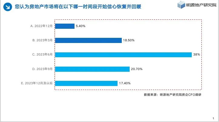 明源地产研究院在今年底走访了十余家标杆房企,并开展了一轮房企CFO问卷调研,数据显示,对于销售回暖时点,38%的企业预计在2023年6月前后,20.7%的房企预计在2023年9月前后,总体预判谨慎乐观。