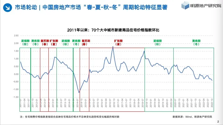 此外,中国房地产市场向来是呈现周期规律的,从70个大中城市新房价格指数环比走势来看,2011年以来,房地产市场从紧缩、萧条再到复苏、扩张,历经了数个“春-夏-秋-冬”的周期轮动。