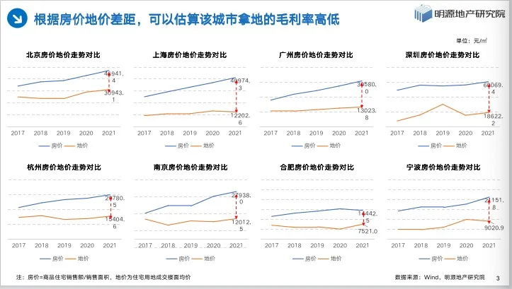 我们知道,地价和房价之间的差距,大体上决定了一个地产项目的毛利空间,因为建筑成本每家房企都差别不大,顶多单方成本差个几百块钱,数量级很小,但在不同城市、不同区域的拿地成本差异却很大。