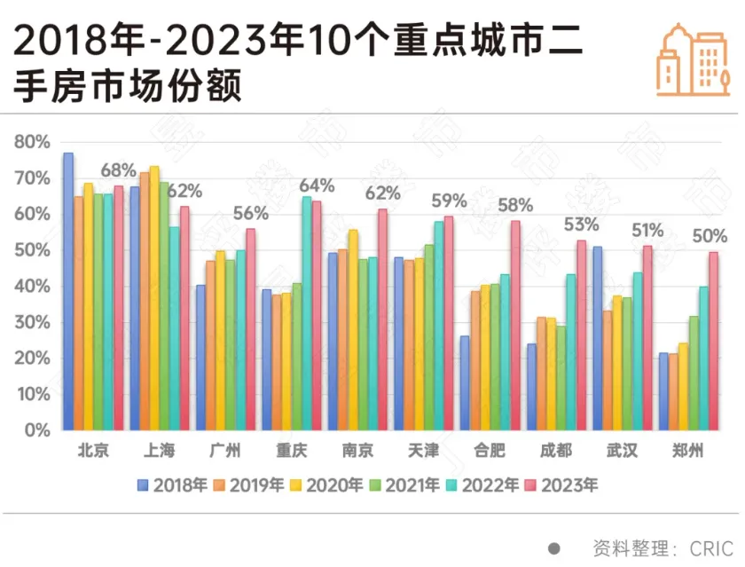 也是在去年底,二手房的市场份额首次超过一手房,达到53%。其中,北京、上海、重庆、南京二手房市场份额更是达到了60%以上。