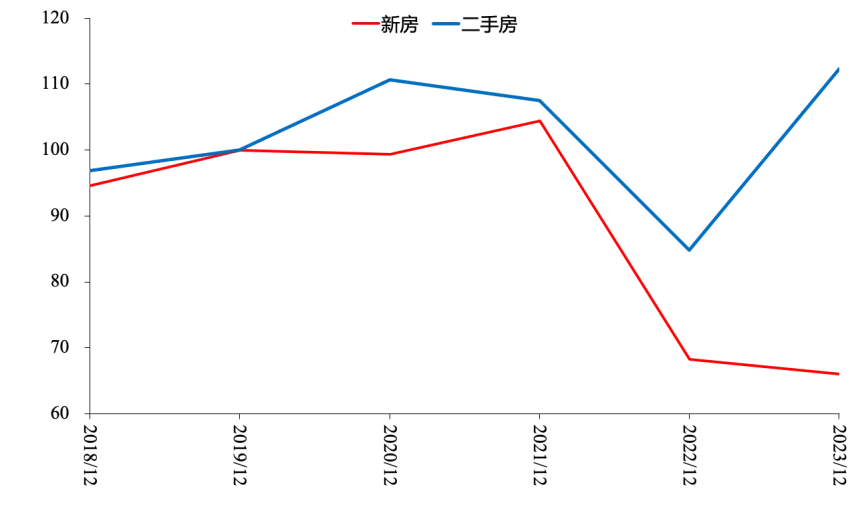 由于房企拿地及开工量收缩,近两年新房的供应量也随着跳水。