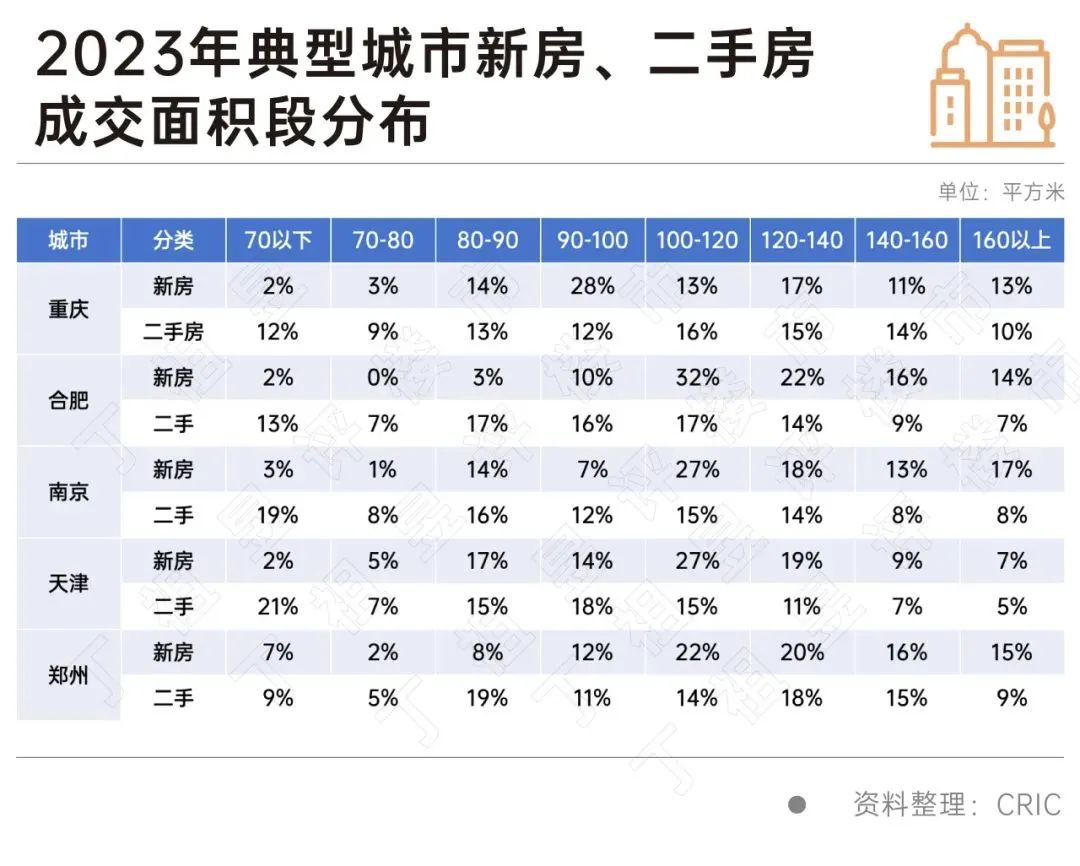 如下是克而瑞统计的部分典型城市新房及二手房成交面积段分布情况,不难看出,90㎡以下面积段,二手房成交占比普遍高于新房;而到了90㎡以上,这个交易结构便逆转了,新房成交占比明显高于二手房。