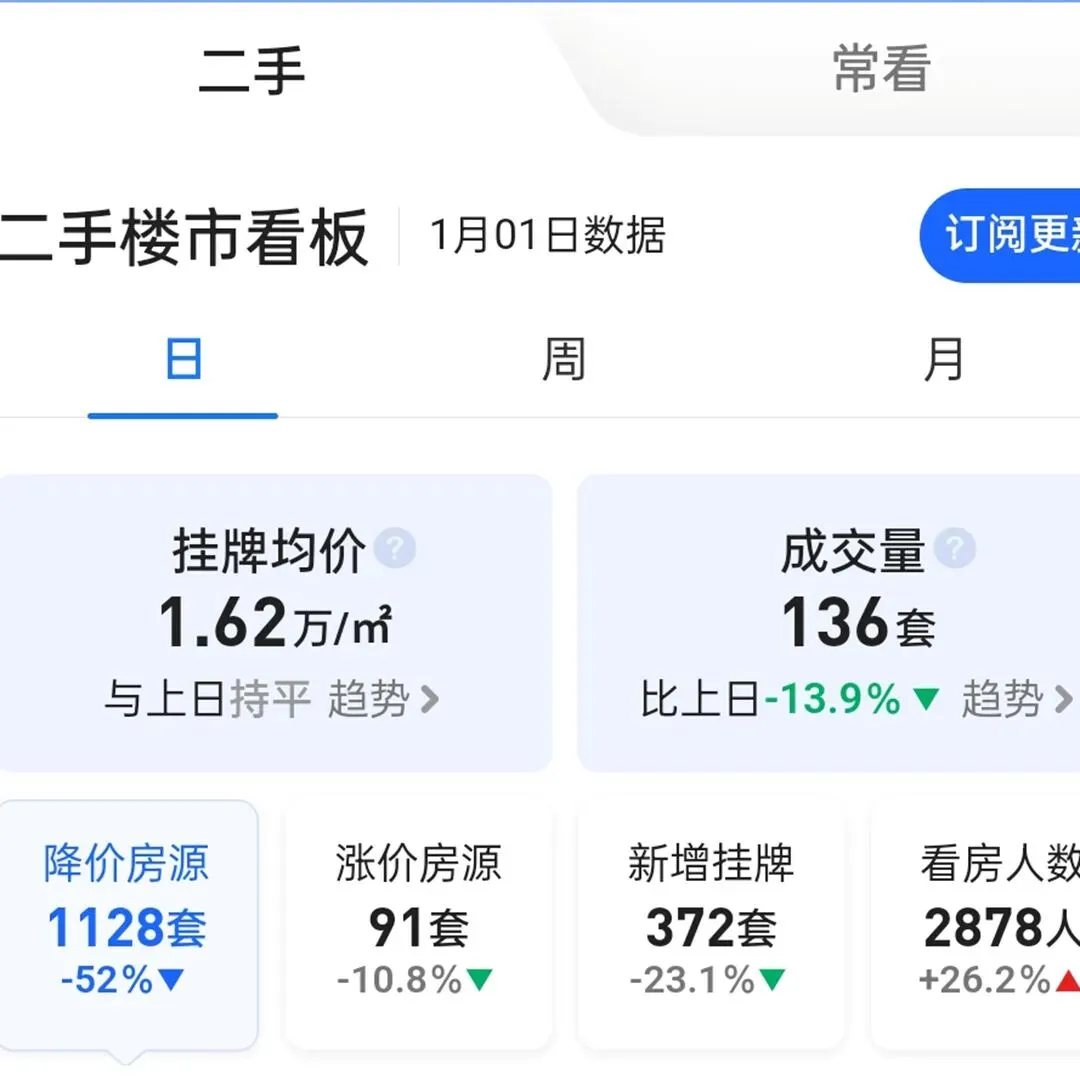 现在二手房市场中的带看数据太重要了,没有带看,就不会有成交。带看反映了买家对房源的认可,一月一日天津二手房的带看人数达到了2878人,大涨了26.2%,不知道你的房子有人看了没有?带看量真的是一个很重要的数据,如果你的房子一个月都没有一个带看,那么就你要考虑折腾一下了,至于怎么折腾,可以参考房叔之前的文章想要卖掉二手房,必须学会折腾。2026年第一天,天津的二手房市场三大数据的变化相当喜人。当然市场的底部不是一天两天形成的,尤其是二手房,毕竟25万套的挂牌房源会涉及到20万个以上的房主,人多了,总会有急于卖房变现的,着急的人多了,底部就不再是底部。二手房的底部应该是买出来的,而不卖出来的,现在已经有一些外地买家抄底天津的低价房源,如果天津二手房的成交量连续多天超过新增挂牌量,可能就真的是底部了。