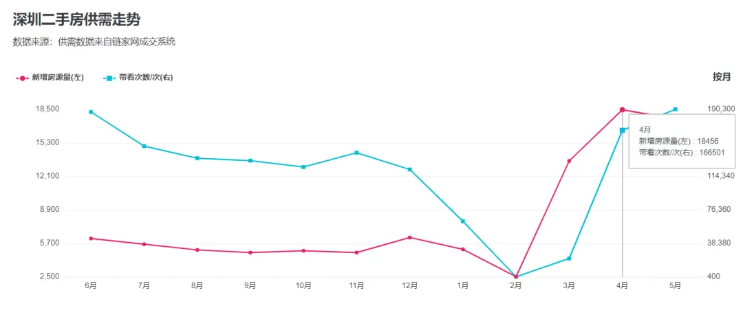 值得一提的是,深圳二手房挂牌量看起来总量不高,但最近3个月的新增房源接近5万套,月均1.7万套,而去年同期每月新增房源仅有6000套左右。