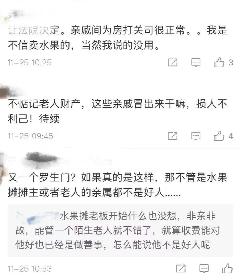 直到最近,媒体报道了老人通过意定监护的方式将房产赠予水果摊主,同时称亲属们无人问津。“看到报道,我们很伤心,不照顾老人有违孝道,我们绝对不会做这种事。”吴女士告诉记者。