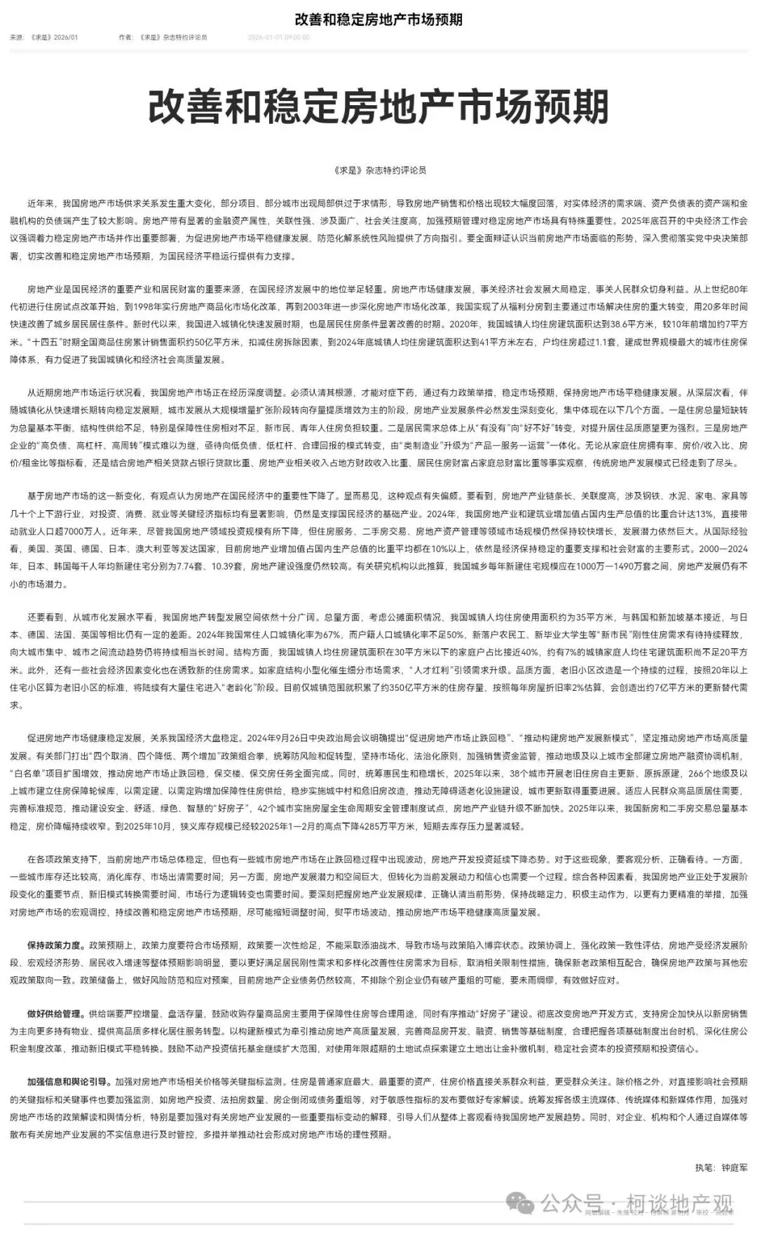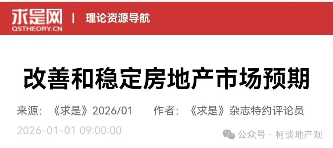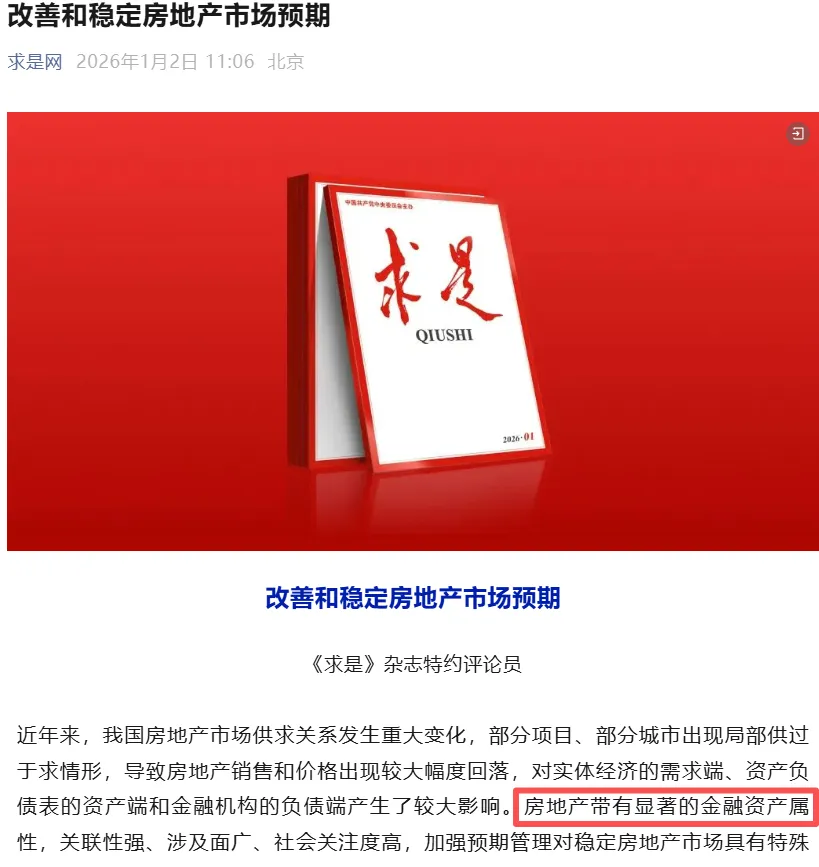 2026年1月1日元旦这天,2026年第1期《求是》杂志发布了一篇重磅评论员文章《改善和稳定房地产市场预期》。