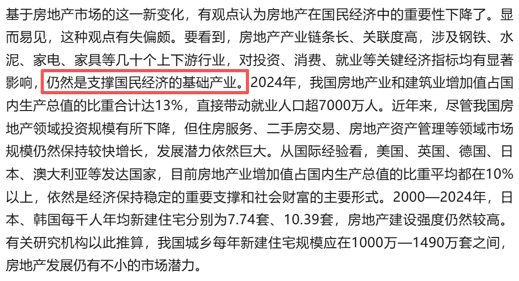 其次,官媒强调,房地产是支撑我国国民经济的基础产业。