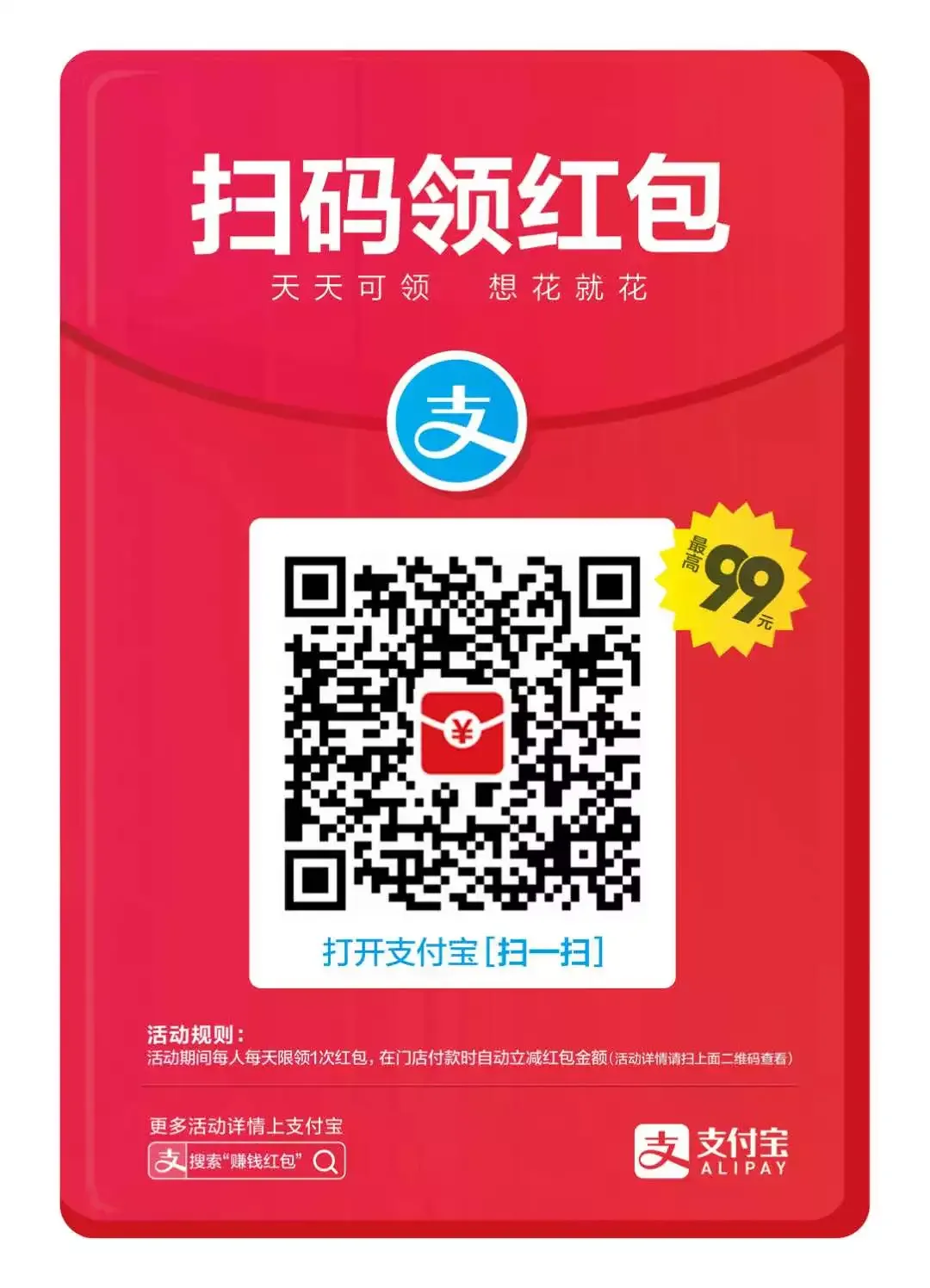 1、支付宝红包要打开支付宝页面,扫上面的二维码,用微信扫描无效。(由于微信上不能直接扫这个嘛,建议大家可以把上面的二维码图片保存到电脑或手机上,每天用支付宝扫码领红包,在实体店付款时红包会自动抵扣的)
