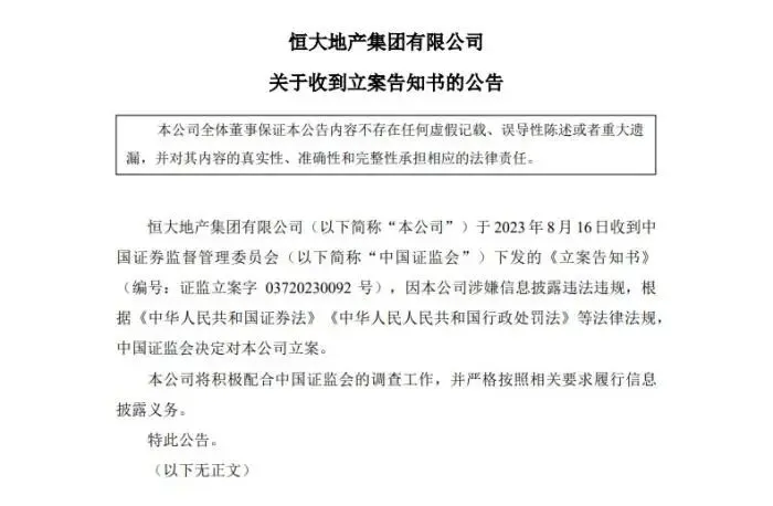 8月16日晚间,恒大地产集团有限公司(简称“恒大地产”)于沪深交易所发布关于收到立案告知书的公告。