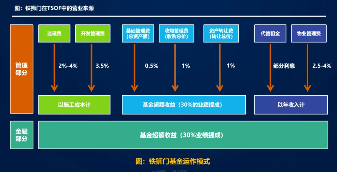 第一部分主要是建设运营管理,与代建业务类似,铁狮门以少量资金入股项目基金,并作为基金的管理者,其收益包括: