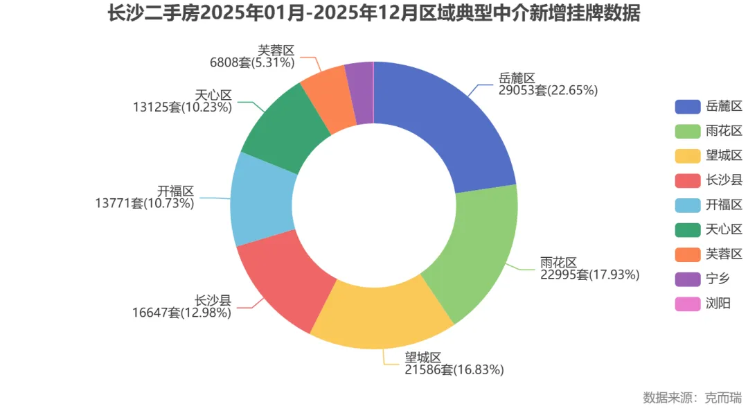 岳麓区不仅挂牌量最大,成交量也最为活跃,占比近26%,市场地位稳固。雨花区和望城区分列二、三位,共同构成长沙二手房市场的核心三角。数据来源于克而瑞。
