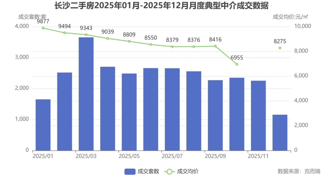 2025年,长沙二手房价格整体呈震荡下行趋势。年初均价在9800至9900元/㎡之间,6月一度跌至8600元/㎡,半年跌幅达12%。下半年价格有所企稳,年末维持在8800元/㎡左右。