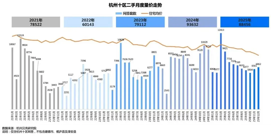 据杭州贝壳研究院数据,2025年杭州二手房一共卖了88456套。