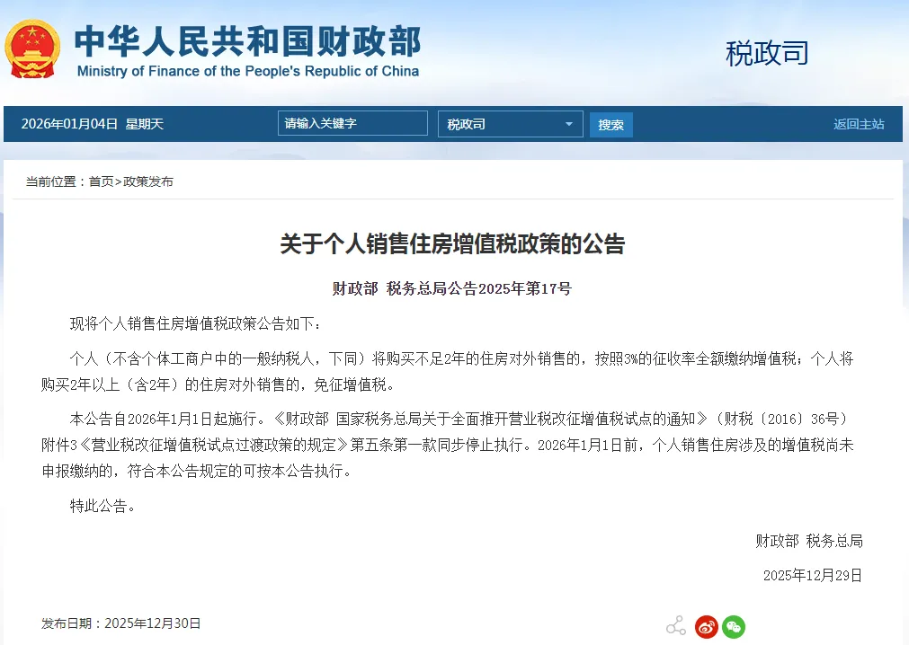 另外,就在节前,财政部、税务总局发布《关于个人销售住房增值税政策的公告》。