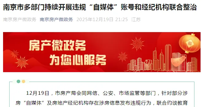12月19日,市房产局会同网信、公安、市场监管等部门,针对部分涉房“自媒体”及房地产经纪机构存在涉房信息发布违规行为,联合约谈。