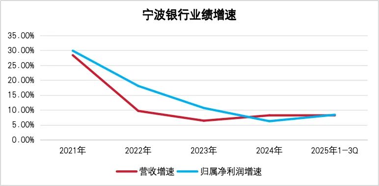 拉长视线看,宁波银行“涨不动”早有迹象。其营收增速在2018年-2021年均保持着两位数,但自2022年起大幅下挫,2022年—2024年分别为9.67%、6.4%、8.19%。