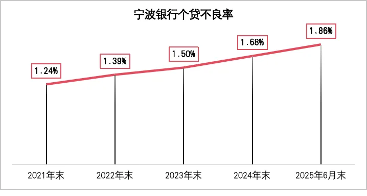 数据不会说谎,2021年末—2024年末,宁波银行个贷不良率逐年上扬,分别为1.24%、1.39%、1.5%、1.68%。