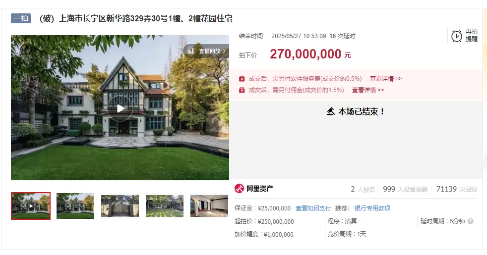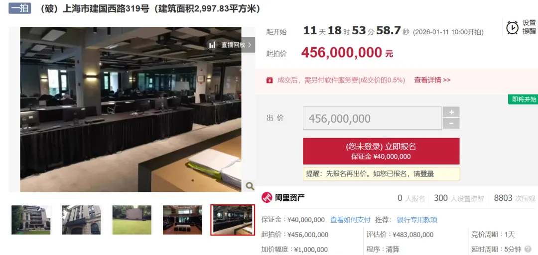 目前,该洋房已经上架阿里拍卖(资产交易),起拍价4.56亿。