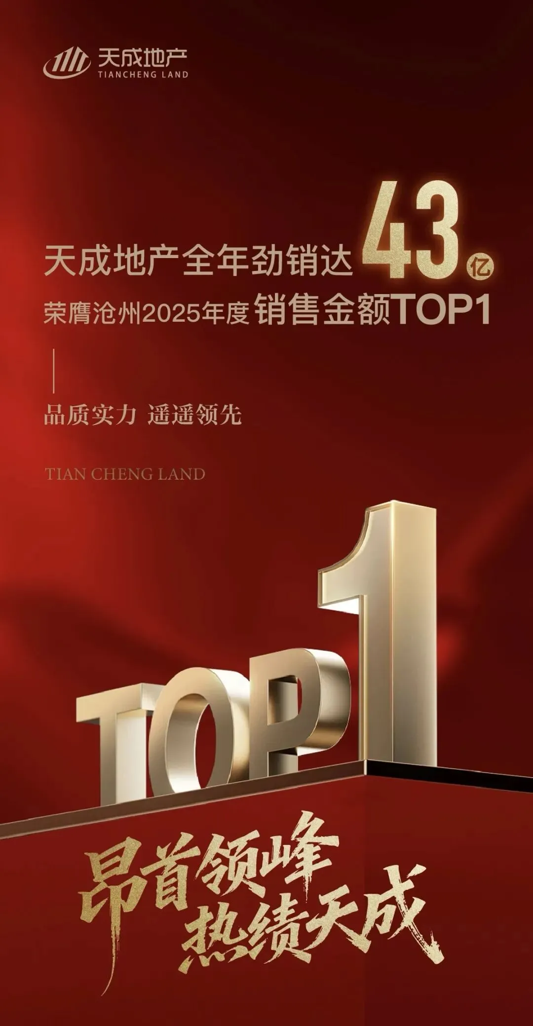 2025年,沧州房地产市场年度数据发布,天成地产以全年销售额约43亿元的卓越战绩,荣膺沧州2025年度销售金额TOP1,再次强势登顶沧州楼市榜首,以断层级优势实现市场领跑,诠释了何谓真正的领军者。