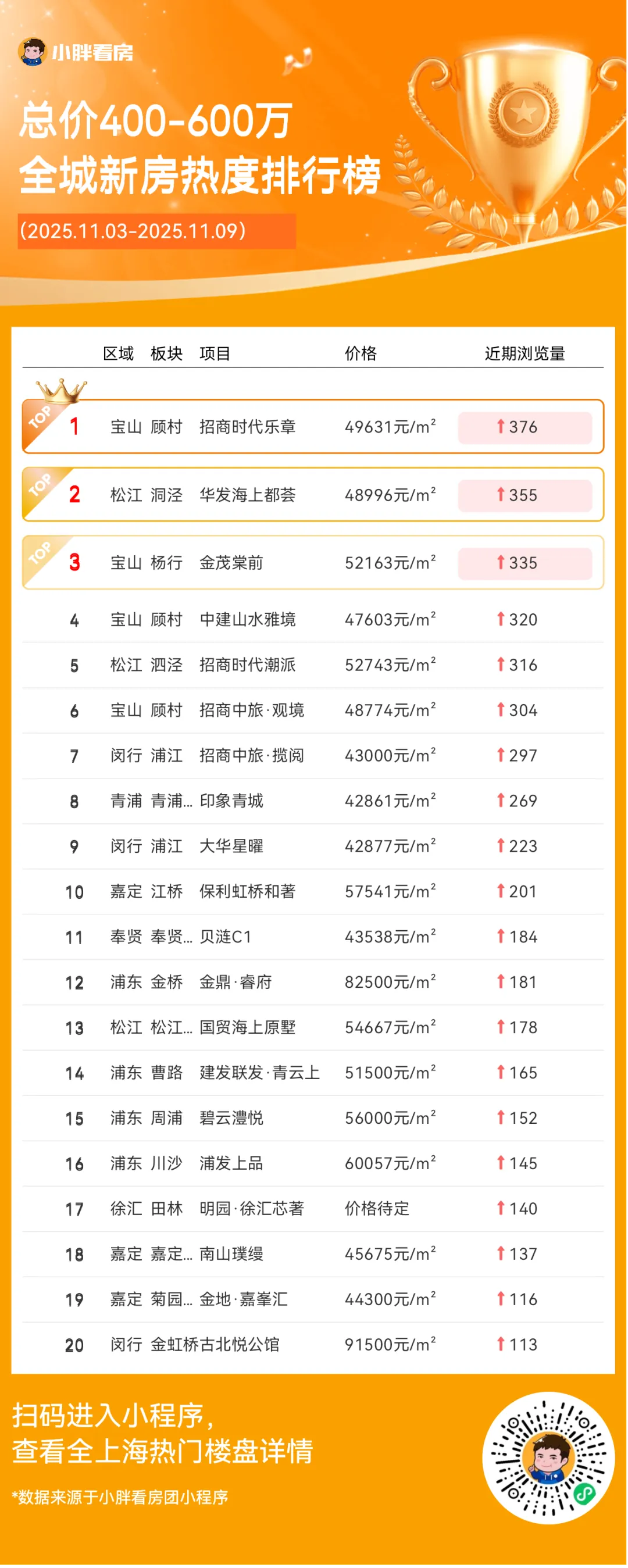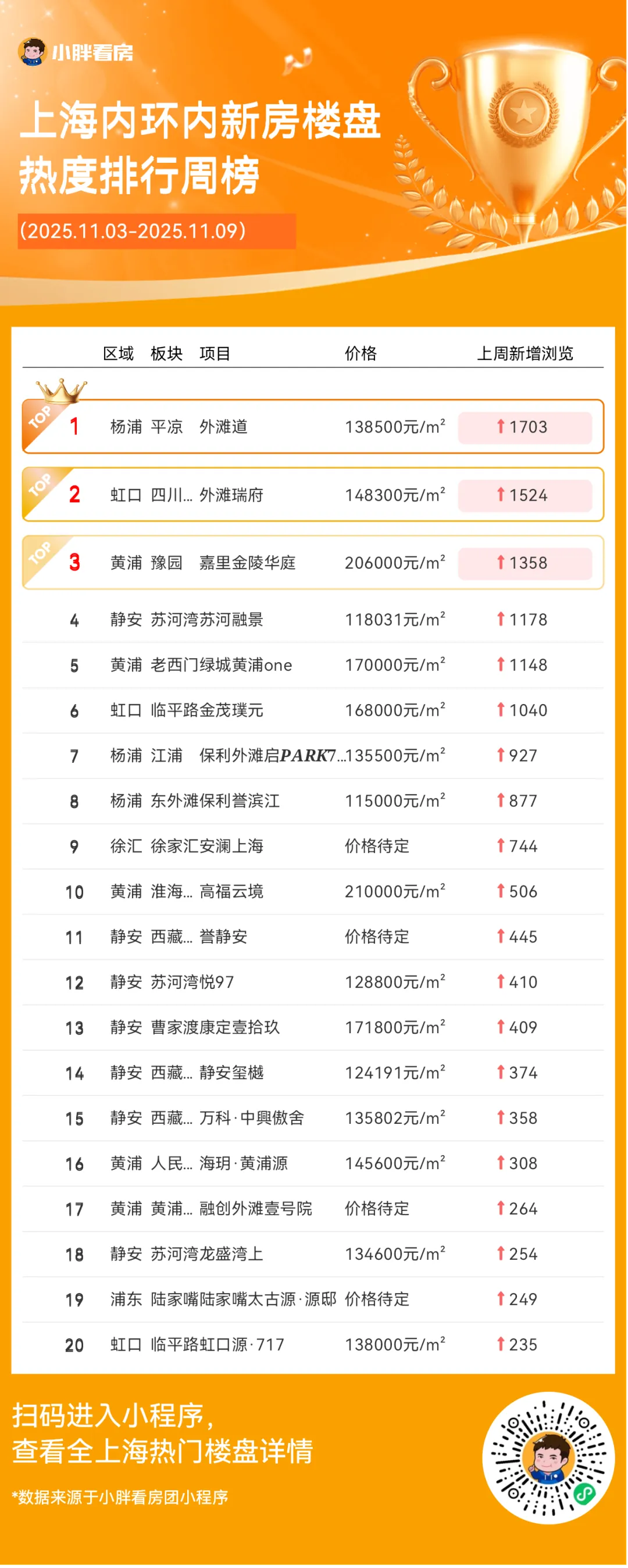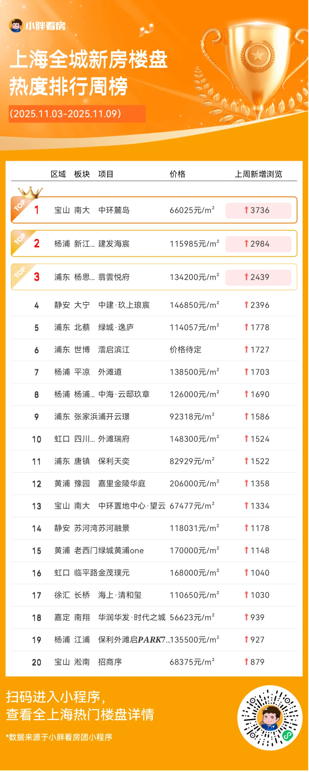 小胖看房团小程序发布一周新房热度榜单(根据新增浏览量排名),分全城榜和总价榜。看看本周谁的人气最高?你心仪的楼盘是否上榜吧~上海二手房最新成交量:昨日(11月9日)网签990套(含住宅、商业、车位等)。