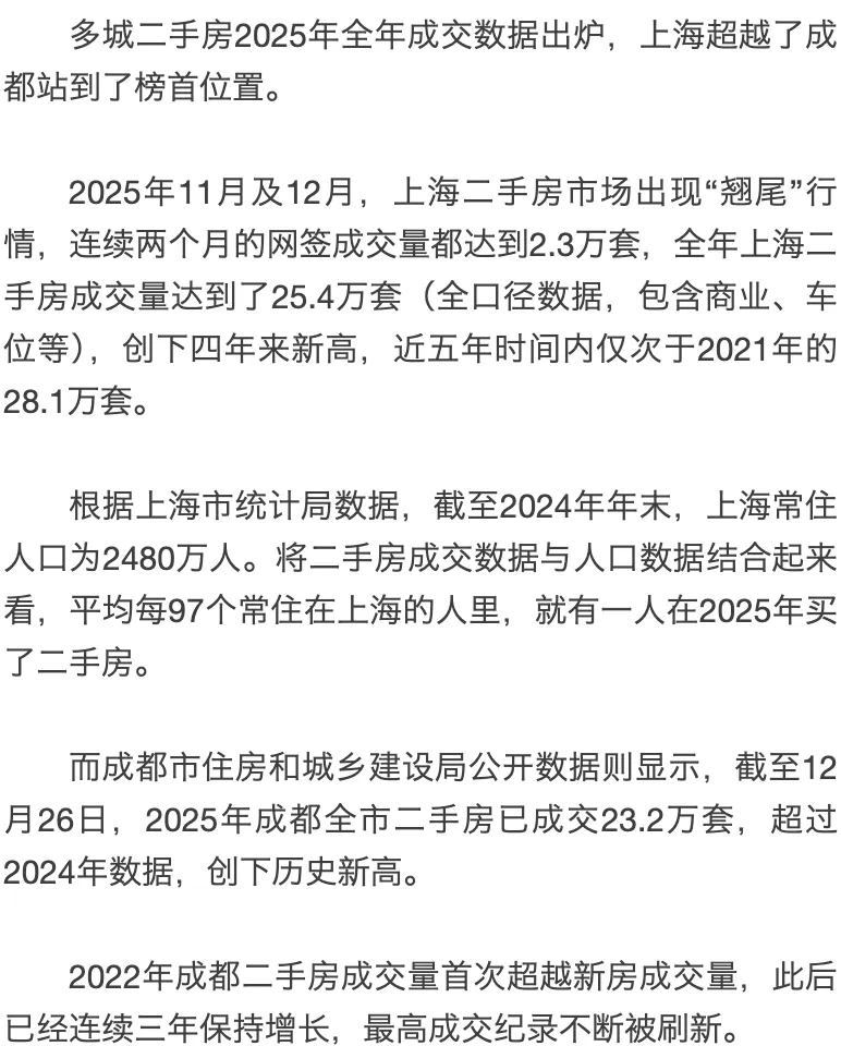随着2025年楼市正式收官,多个重点城市交出二手房市场“年度成绩单”:达25.4万套,创四年来新高。